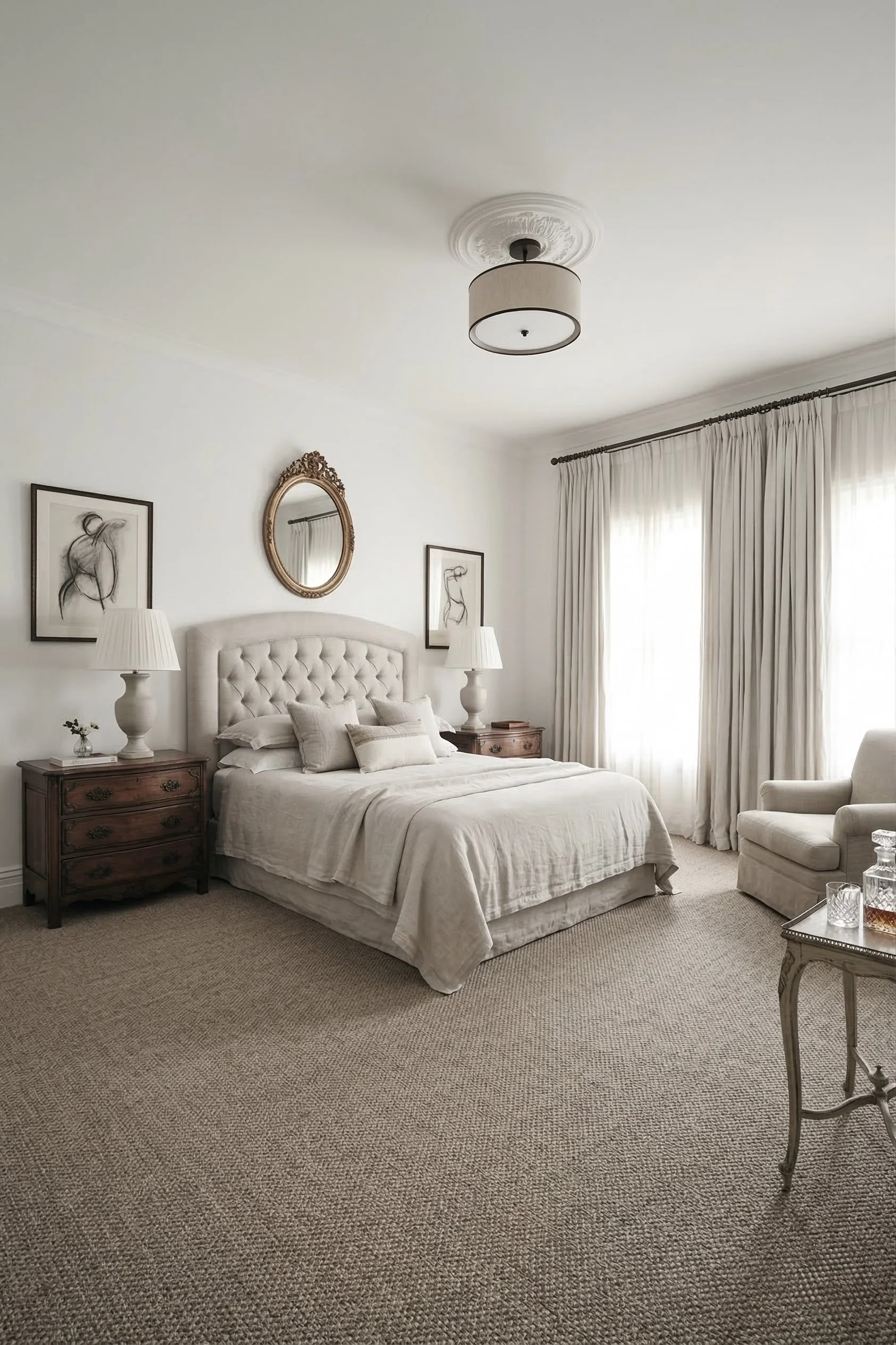 We selected Driftwood Sisal for its unique "chameleon" properties. Unlike flatter beiges, Driftwood contains multi-tonal fibres that pick up both the warm wood of the antiques and the cool, chalky whites of the plastered walls.